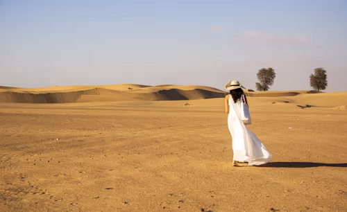 - Colour Palette: Embrace earthy tones and soft colours. Cream, beige, ochre, terracotta, dusty pink, and slate blue harmonise beautifully with the desert environment. Alternatively, flowing white or black outfits can create a stunning, high-contrast, and elegant look.